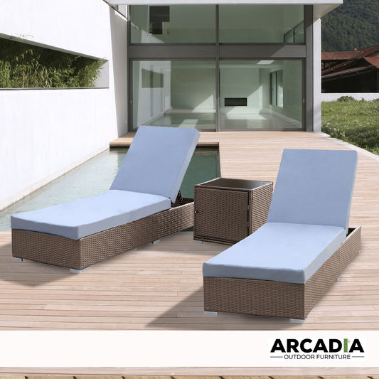 Arcadia Furniture Outdoor 3 Piece Sunlounge Set Rattan Garden Day Bed Lounger - Oatmeal and Grey
