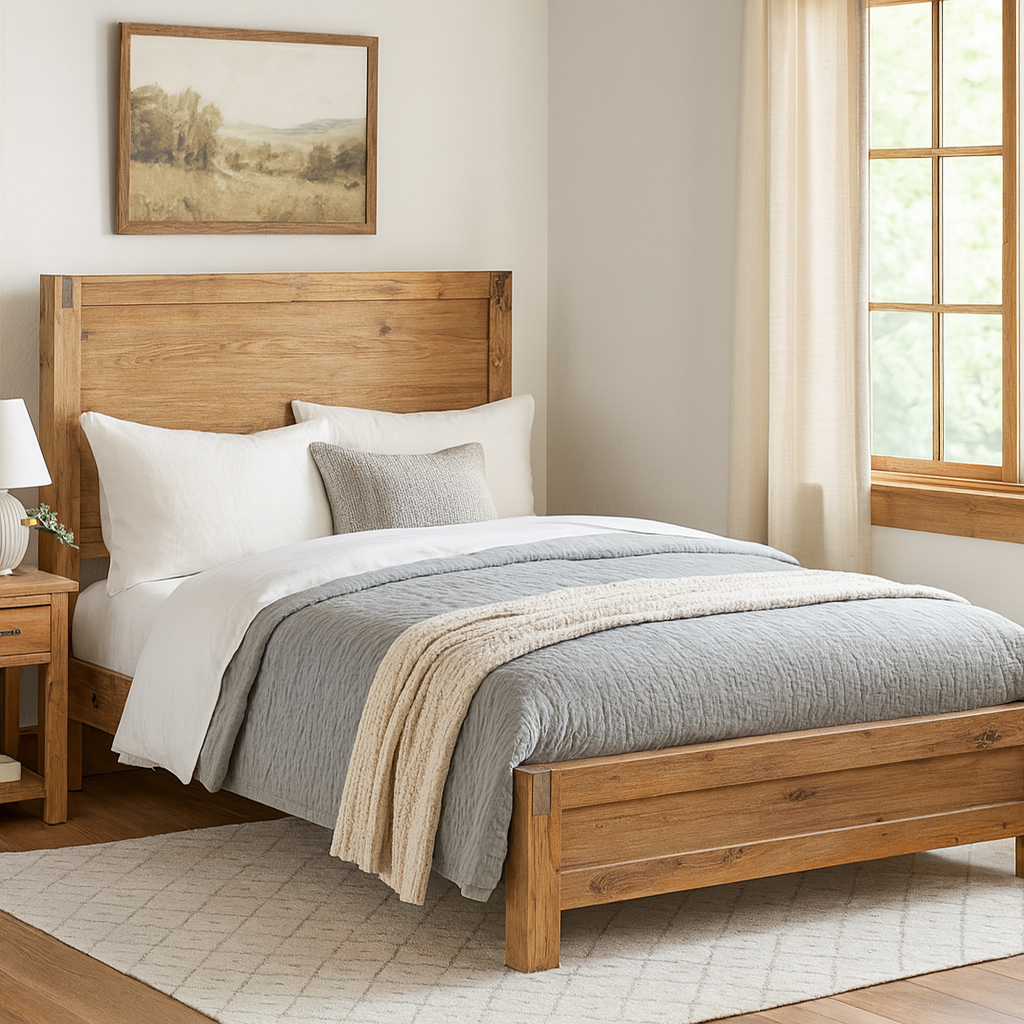 It has medium high headboard which is square in shape. This feature is suitable for comfortable leaning back. MDF Veneered Acacia panel is used in the bed headboard to provide strong and sturdy construction.